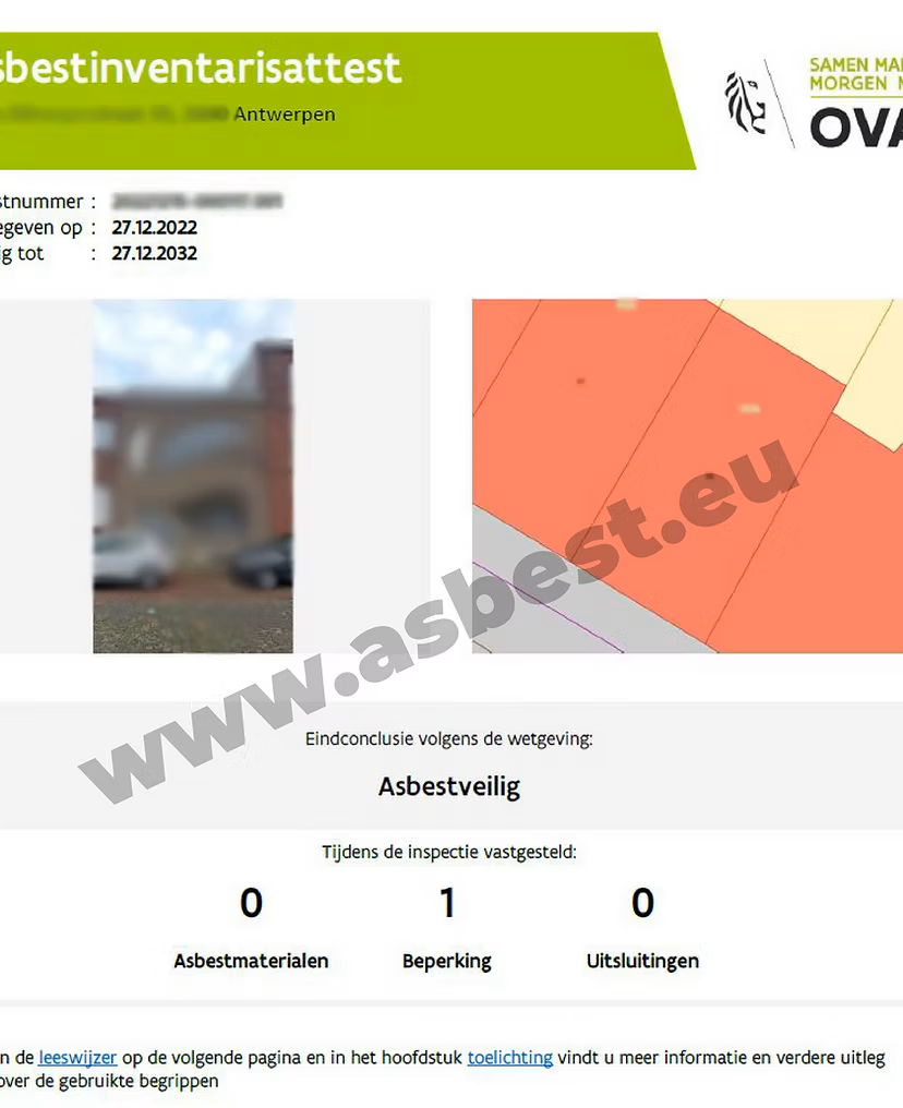 Het asbestattest wordt opgesteld op basis van een asbestinventarisatie van de woning. Voor elk gebouw levert OVAM een uniek asbestattest af. Dit document geeft inzicht in: